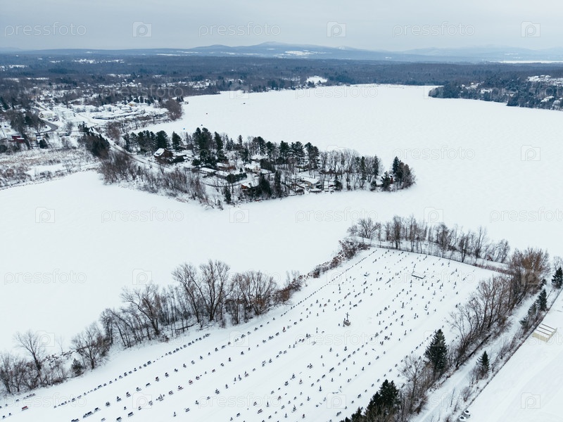Зимний вид из воздуха города Ватерлоо с замерзшим озером, кладбищем, снежными домами и дорогами в Квебеке, Канада. g