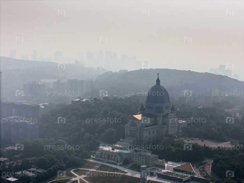 Вид с воздуха Оратория Святого Иосифа среди смога, тумана и тумана над горизонтом Монреаля и зелеными холмами. g