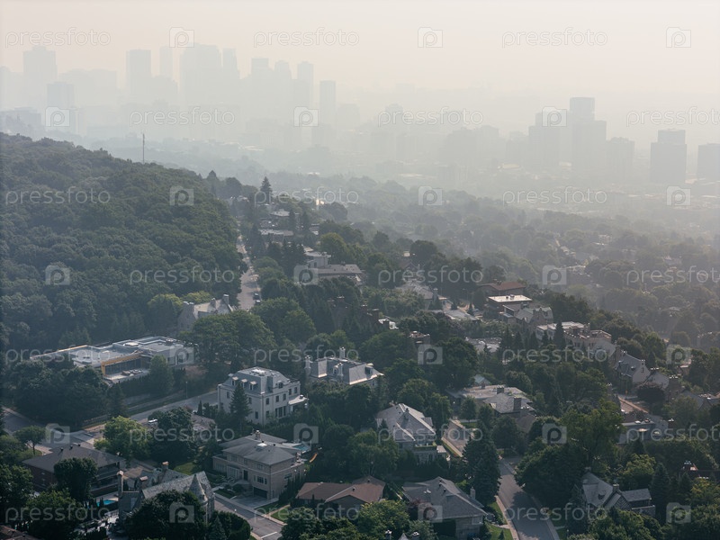 Вид с воздуха Оратория Святого Иосифа среди смога, тумана и тумана над горизонтом Монреаля и зелеными холмами. g