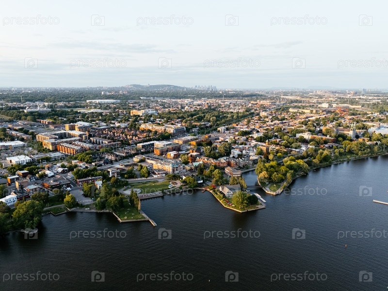 Вид с воздуха на полуостров маяка Rene-Levesque Park в Lachine, Монреаль вдоль реки Святого Лоуренса при закате солнца. g