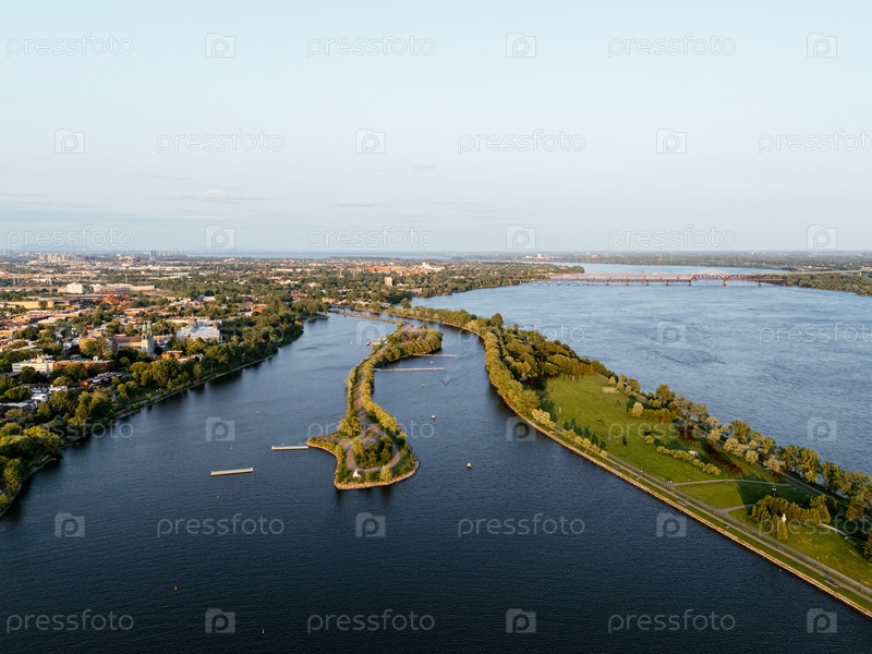 Вид с воздуха на полуостров маяка Rene-Levesque Park в Lachine, Монреаль вдоль реки Святого Лоуренса при закате солнца. g