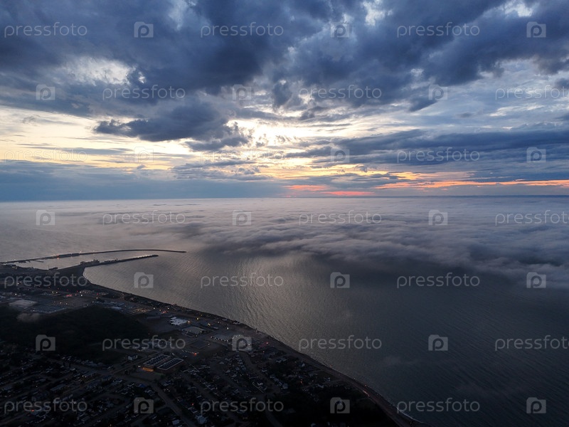 Вид из воздуха города Матане на закате с рекой, туманом, низкими облаками и городскими огнями вдоль реки Святого Лоуренса, Квебек, Канада. g