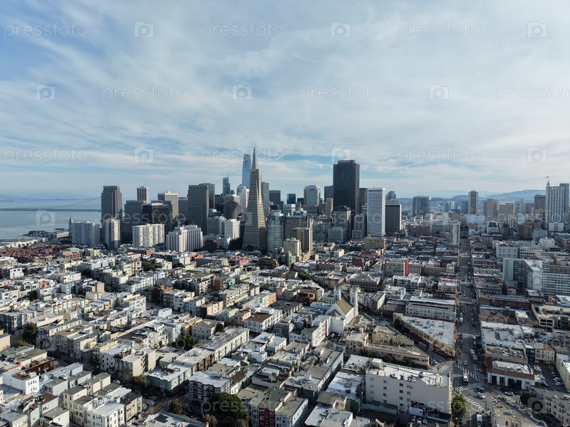 Вид из воздуха с беспилотника на горизонт Сан-Франциско с Трансамериканской пирамидой, городским ландшафтом в центре города и мостом Бей Бридж, Калифорния. g