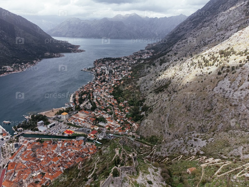Вид из беспилотника на Которский залив и прибрежный город Котор, Черногория