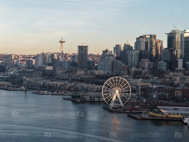 Сиэтлский горизонт с космической иглой и круговым колесом на берегу моря при закате, городской пейзаж, Вашингтон США. g