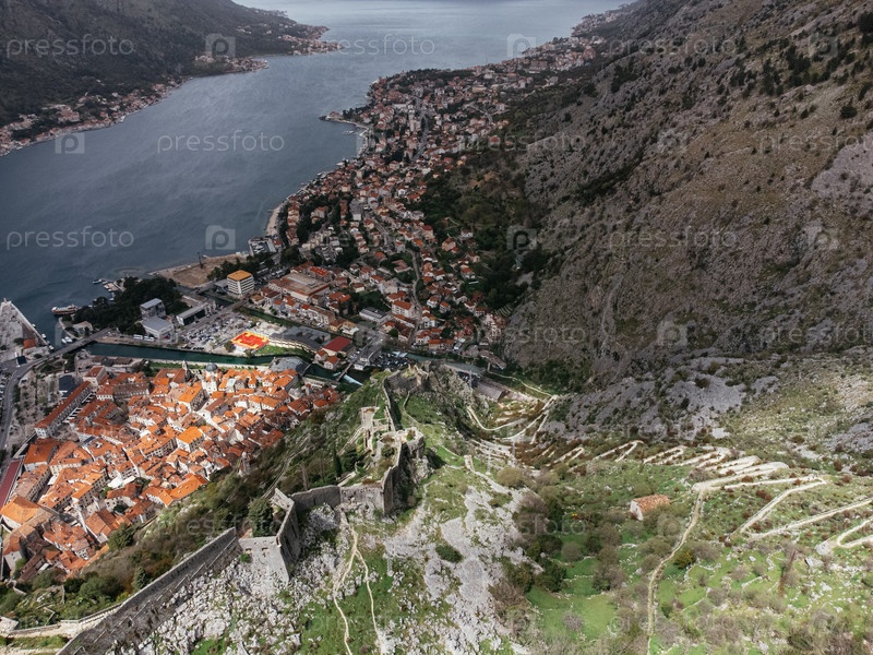 Вид из беспилотника на Которский залив и прибрежный город Котор, Черногория