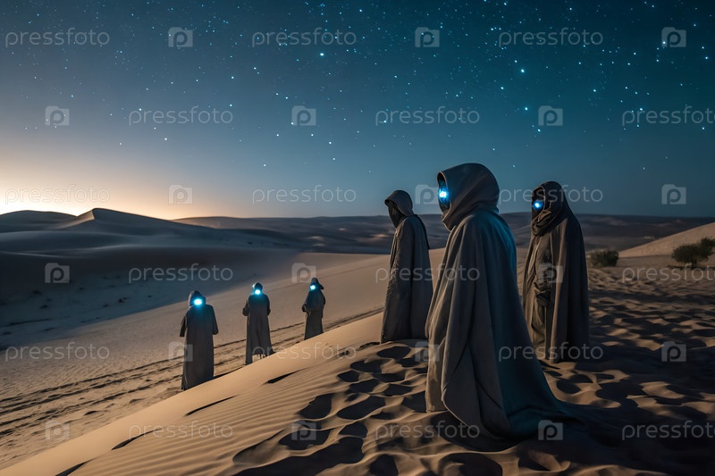 Мистические фигуры с капюшоном, выполняющие ритуал со свечами в сюрреалистическом пустынном пейзаже под сияющим инопланетным небом ночью. g