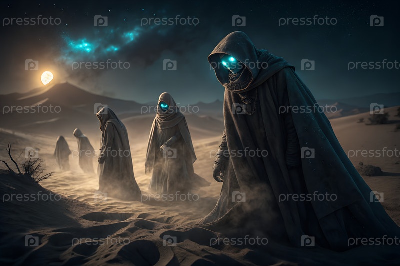 Мистические фигуры с капюшоном, выполняющие ритуал со свечами в сюрреалистическом пустынном пейзаже под сияющим инопланетным небом ночью. g