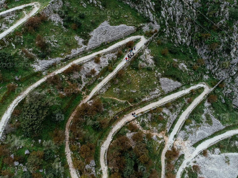 Вид с воздуха горной serpentine дороги в Которе, Черногория