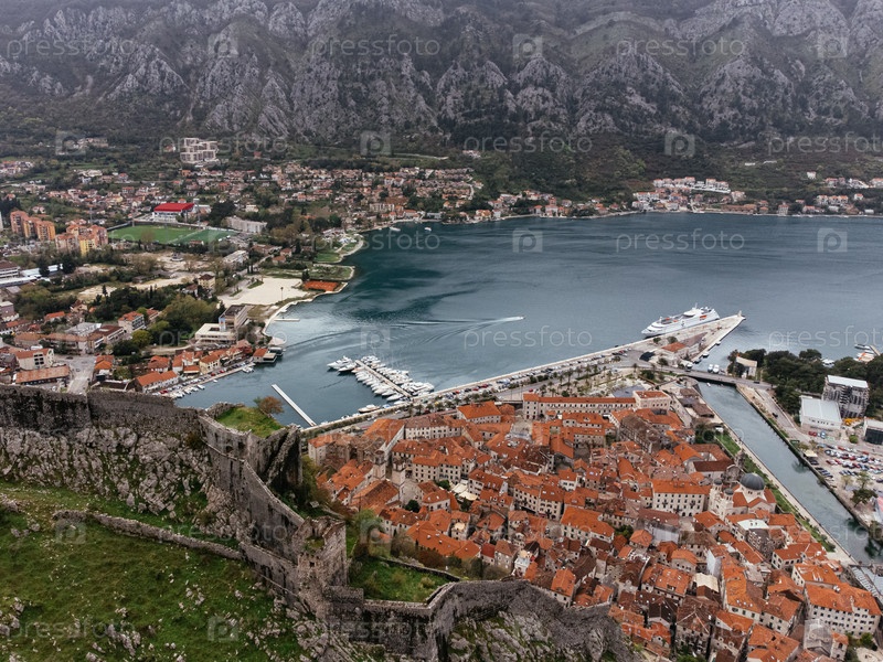 Вид с беспилотника на Которский залив и прибрежный город Котор, Черногория