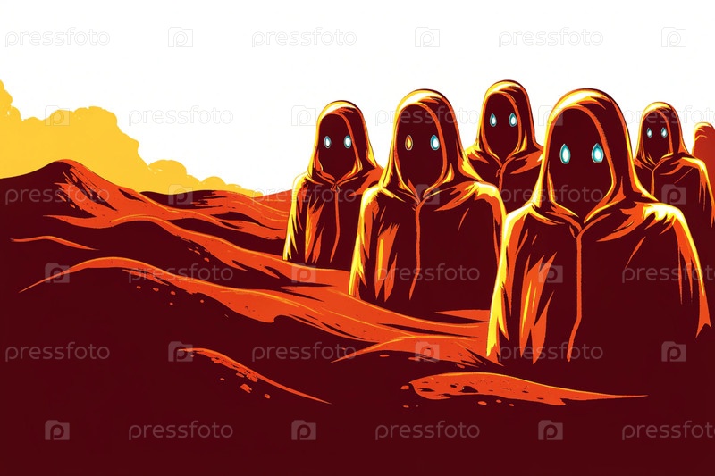 Мистические фигуры с капюшоном, выполняющие ритуал со свечами в сюрреалистическом пустынном пейзаже под сияющим инопланетным небом ночью. g