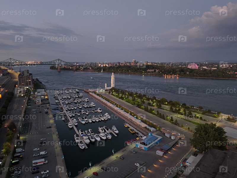 Горизонт Монреаля на закате с часовой башней Старого порта, причалами и городскими огнями, отражающимися в воде. g