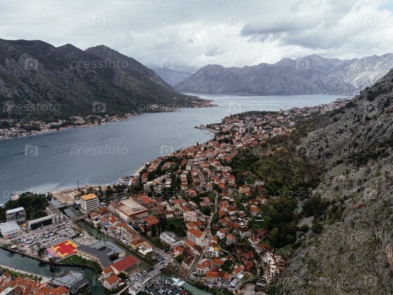 Вид с беспилотника на Которский залив и прибрежный город Котор, Черногория