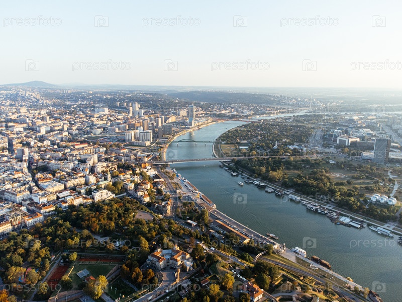 Вид с воздуха над Белградской крепостью Калемегдан и речной панорамой на закате