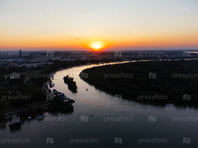 Вид с воздуха на закат реки Белград над Слиянием Савы и Дуная. g