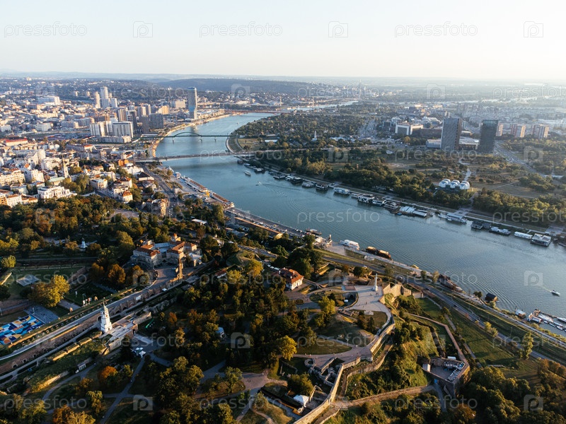 Вид с воздуха над Белградской крепостью Калемегдан и речной панорамой на закате