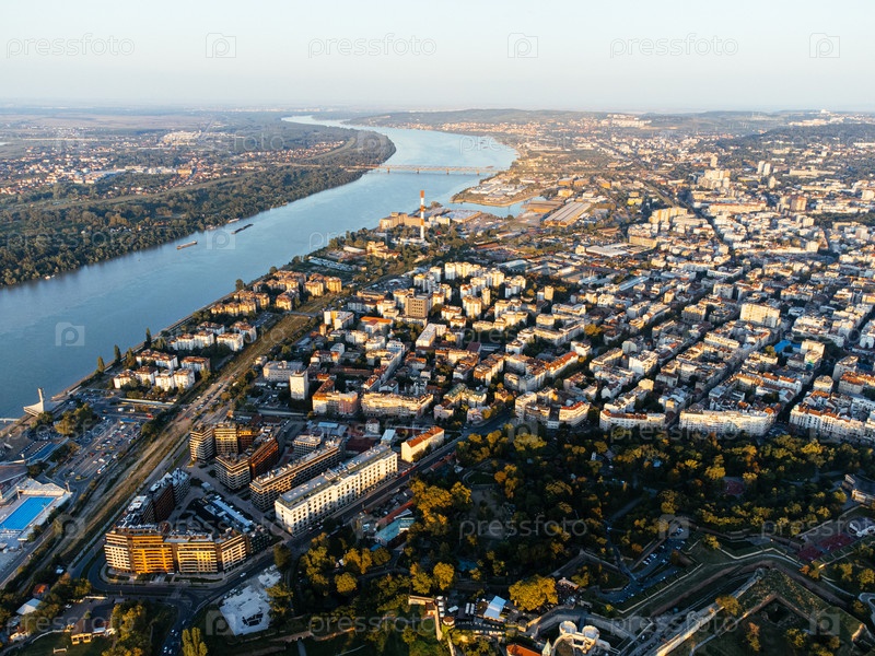 Вид с воздуха над Белградской крепостью Калемегдан и речной панорамой на закате