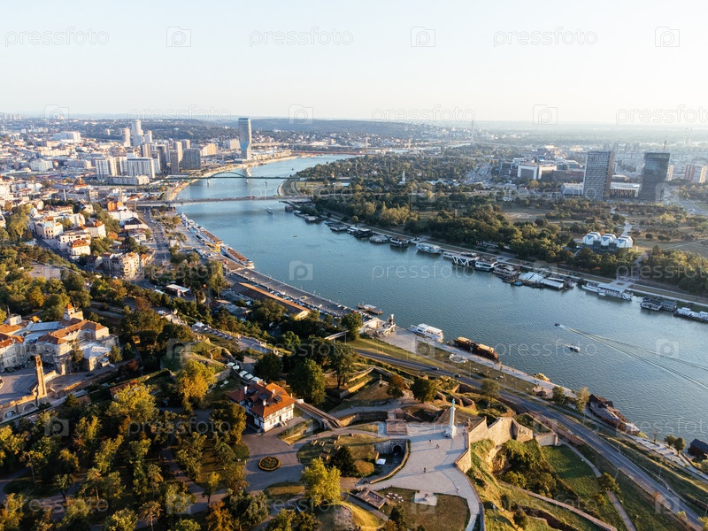 Вид с воздуха над Белградской крепостью Калемегдан и речной панорамой на закате