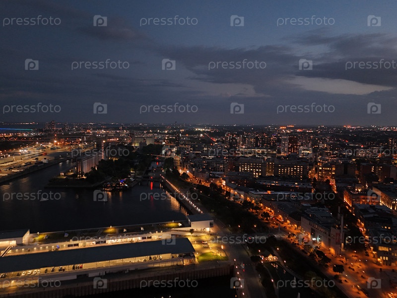 Горизонт Монреаля на закате с часовой башней Старого порта, причалами и городскими огнями, отражающимися в воде. g