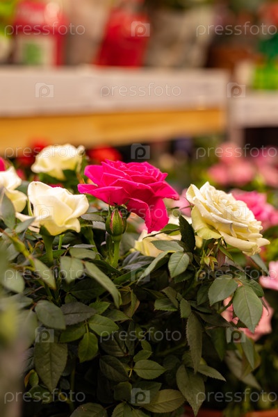 Розы декоративные белые и розовые в горшках в цветочном магазине для продажи