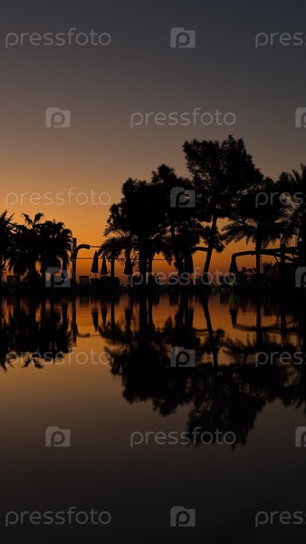 Восход солнца, темные силуэты деревьев отражаются в воде бассейна на территории отеля в Турции