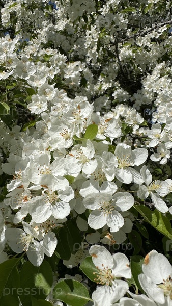 Цветение яблони, белый яблоневый цвет в саду, парке в солнечный весенний день