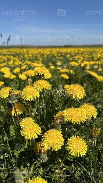 Желтые цветы одуванчика крупным планом на размытом фоне, солнечный весенний день