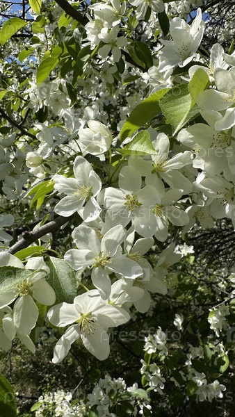 Цветение яблони, белый яблоневый цвет в саду, парке в солнечный весенний день