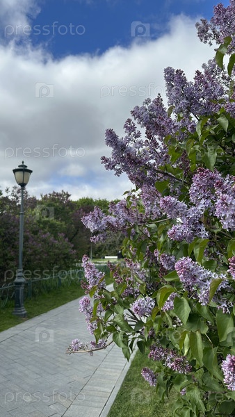 Куст цветущей сирени в городском парке в весенний день