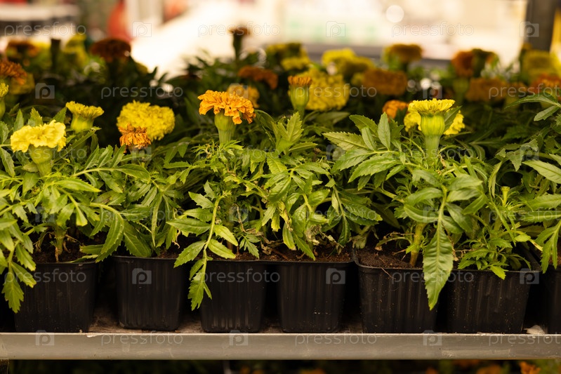 Бархатцы мелкоцветные оранжевые в горшках в цветочном магазине для продажи, рассада цветов
