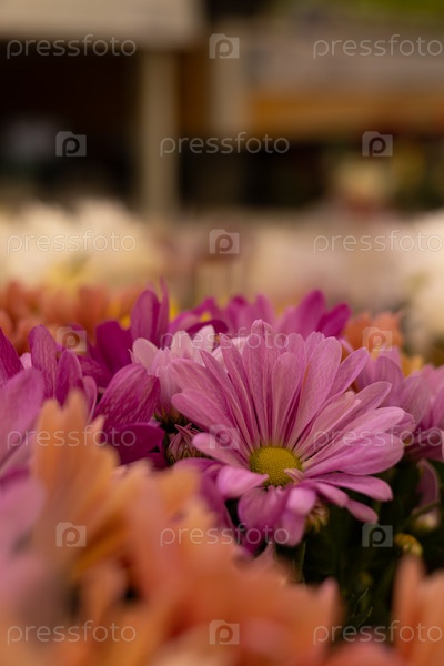 Хризантемы розовые в горшках в цветочном магазине для продажи