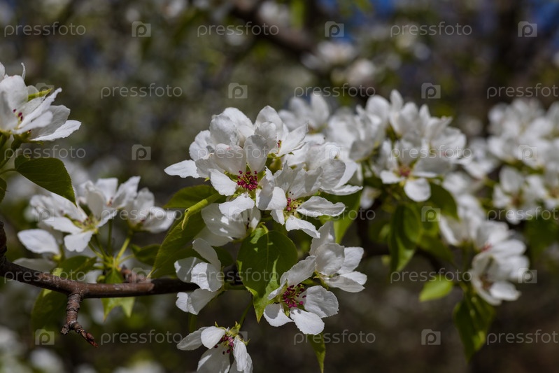 Цветение яблони, белый яблоневый цвет в саду, парке в солнечный весенний день