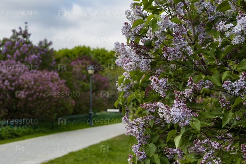 Куст цветущей сирени в городском парке в облачный пасмурный весенний день