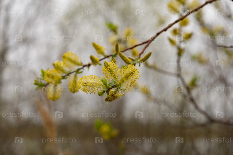 Цветение ивы (вербы), ивовые сережки, весенний день