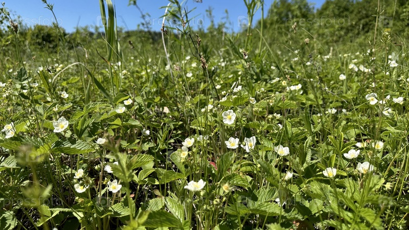 Цветущая летом на лугу клубника дикая луговая полевая лесная