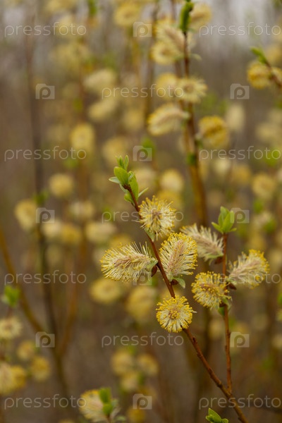 Цветение ивы (вербы), ивовые сережки, весенний день