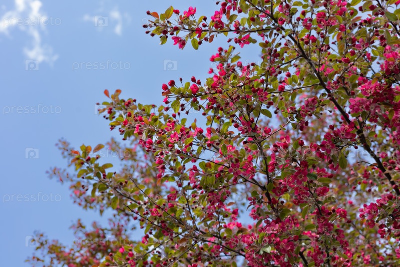 Яркие розовые цветы крупным планом на фоне голубого неба цветущей весной яблони