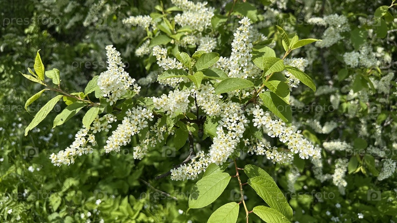 Черемуха цветущая белыми цветами на фоне весеннего леса