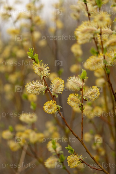 Цветение ивы (вербы), ивовые сережки, весенний день