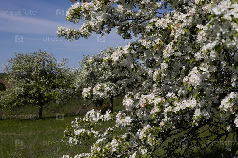 Яблоня цветущая в саду весной, ветви с белыми цветами на фоне голубого неба