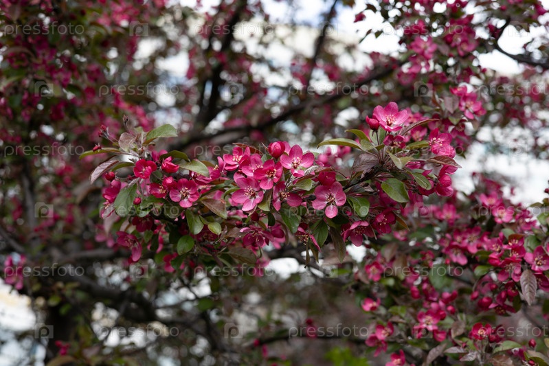 Яркие розовые цветы крупным планом на размытом фоне цветущей весной яблони
