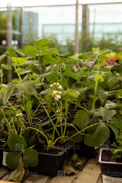 Саженцы клубники и других плодовых и декоративных кустарников в горшках в цветочном магазине для продажи
