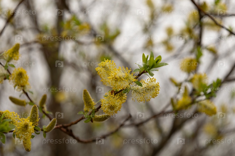 Цветение ивы (вербы), ивовые сережки, весенний день