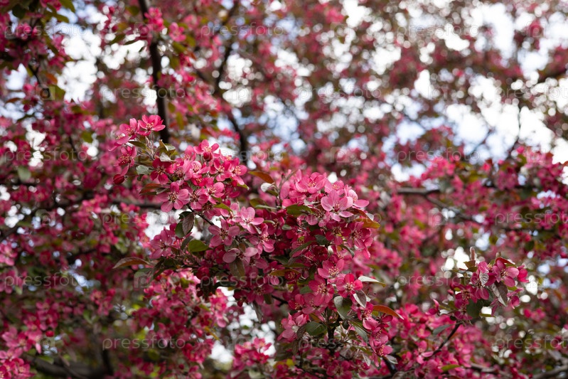 Яркие розовые цветы крупным планом на размытом фоне цветущей весной яблони