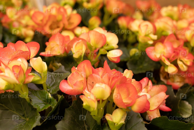 Бегония цветущая, желтая оранжевая в горшке в цветочном магазине для продажи