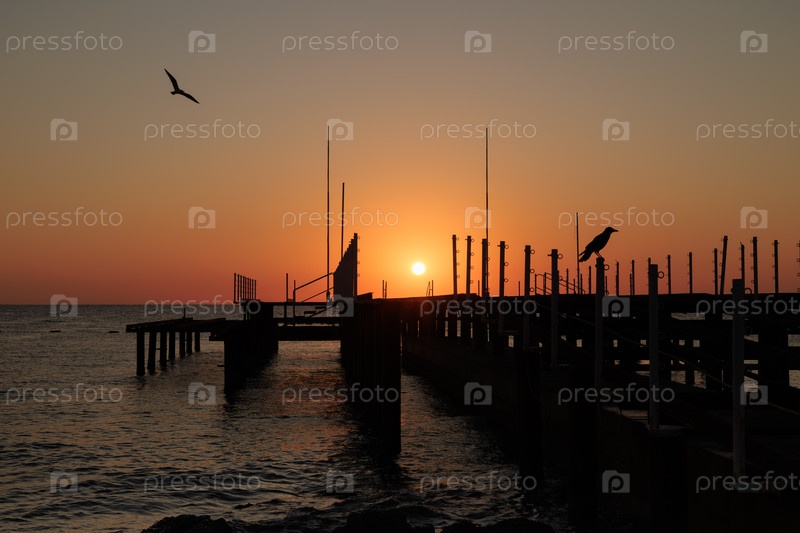 Восход солнца над Средиземным морем в Турции, темный силуэт пирса и птиц