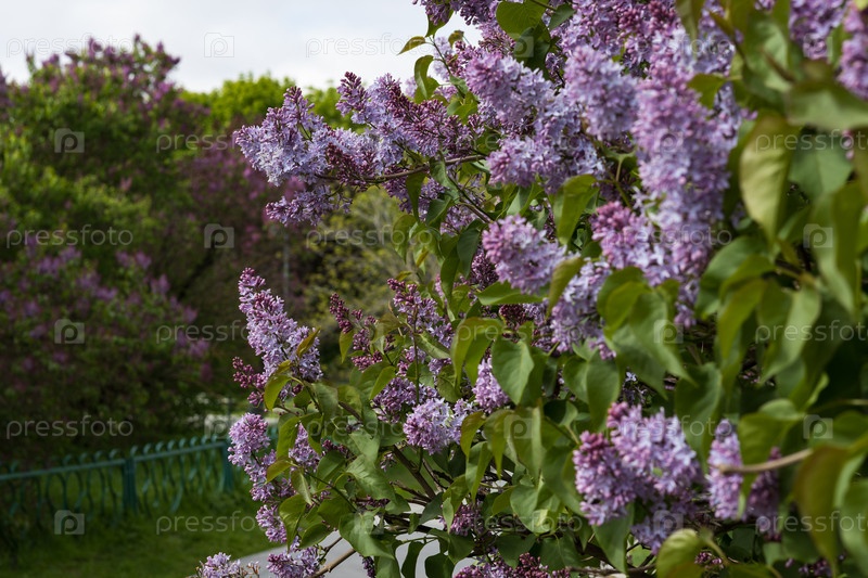 Куст цветущей сирени в городском парке в облачный пасмурный весенний день