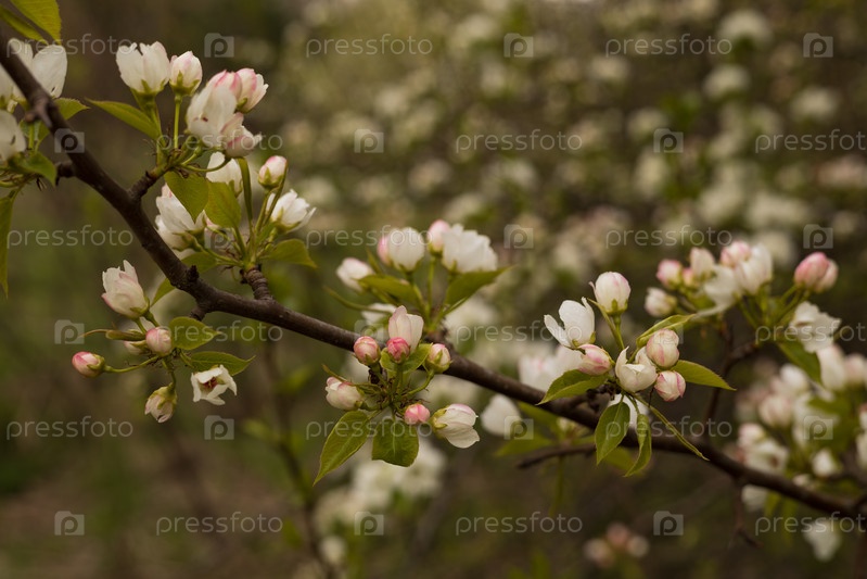 Цветение яблони, белый яблоневый цвет в саду, парке в солнечный весенний день