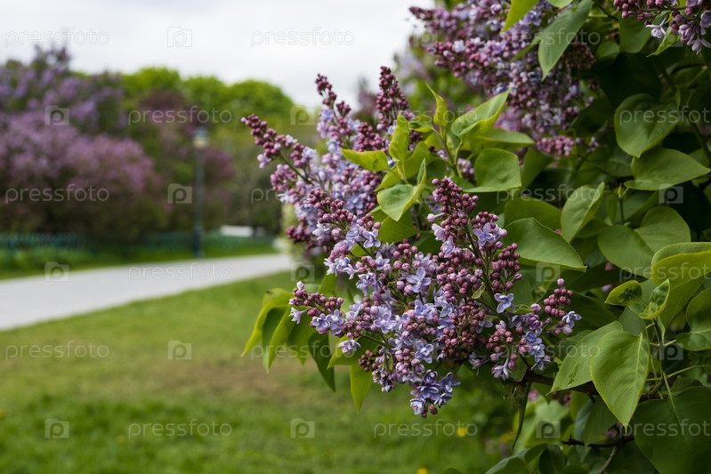 Куст цветущей сирени в городском парке в облачный пасмурный весенний день