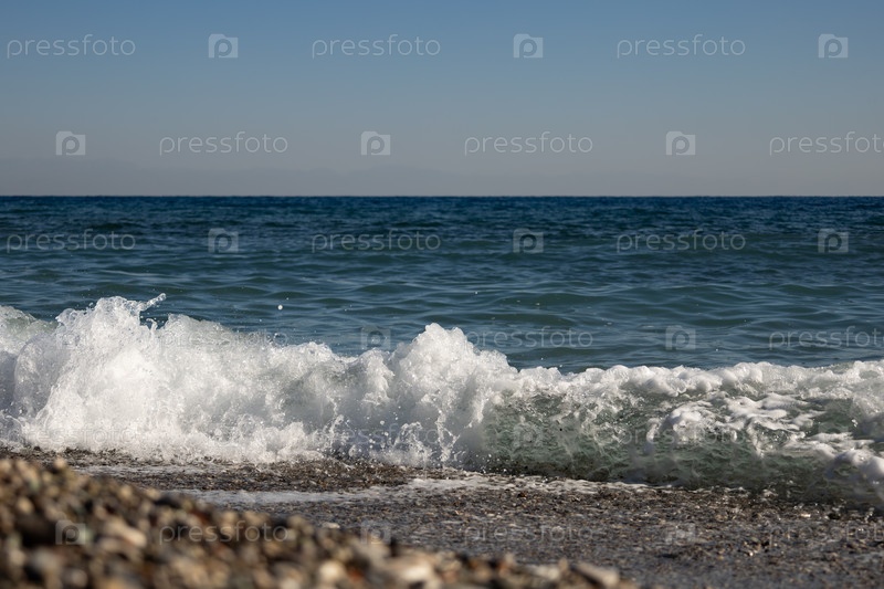 Волна разбивающаяся о прибрежные камни в солнечный день на море, Турция
